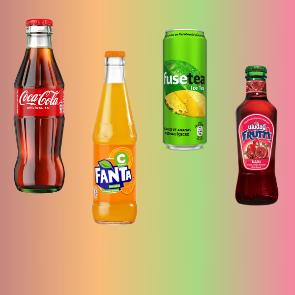 Su, Ayran, Sade Soda, Meyveli Soda, Fuse Tea, Sprite, Coca Cola, Fanta, Enerji İçeceği